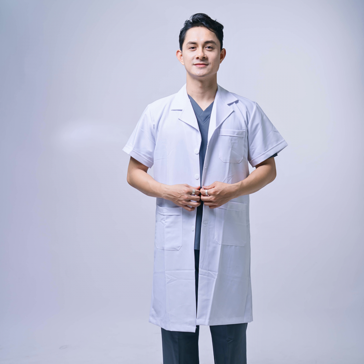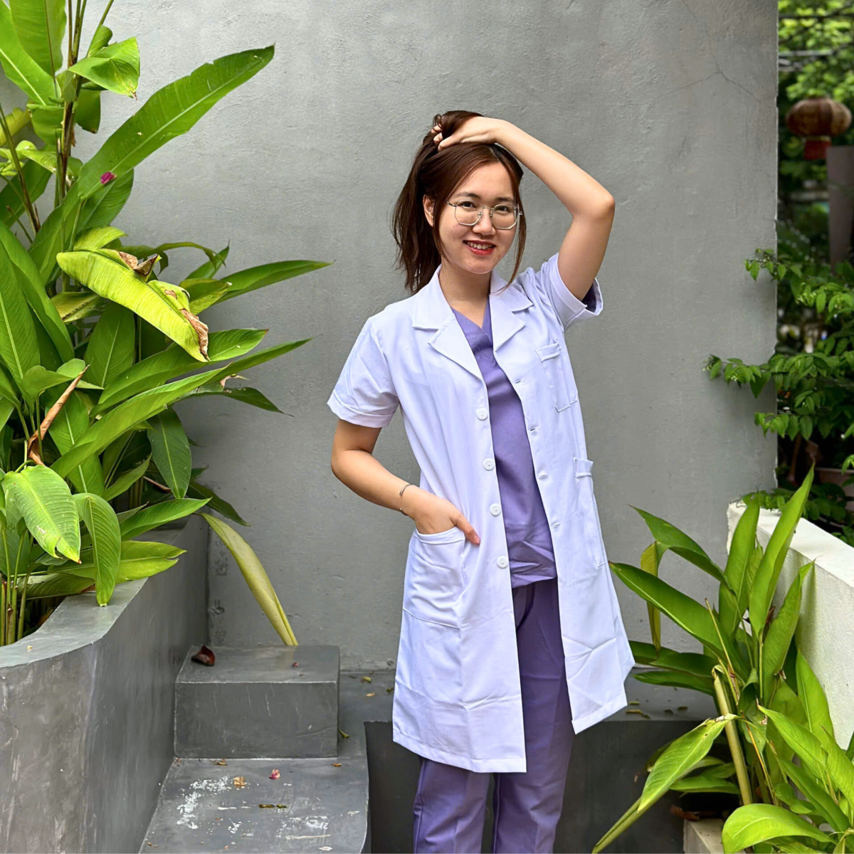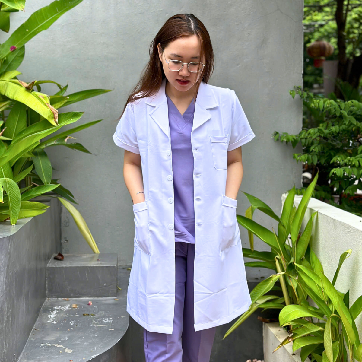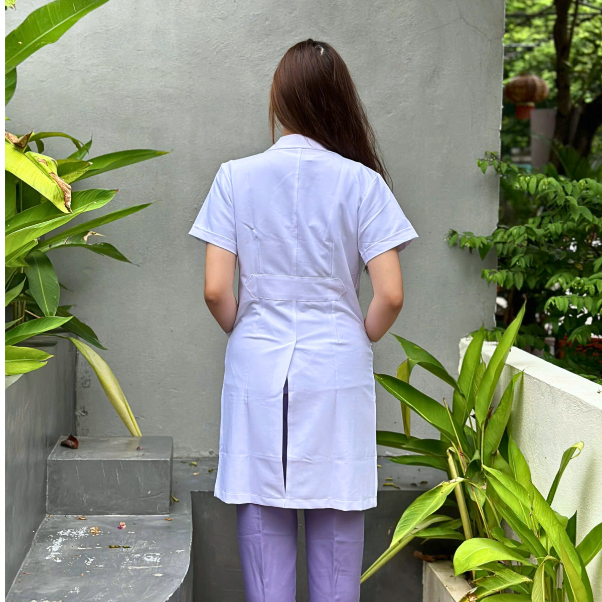 Form dáng đứng, cổ ve lịch sự, tạo sự tin tưởng với bệnh nhân.