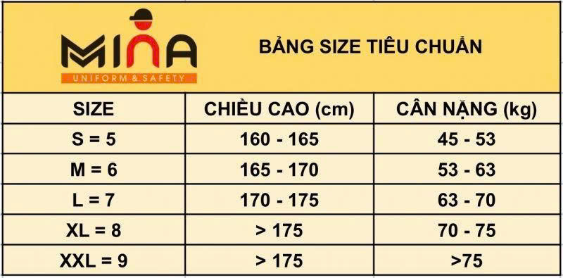 Dưới đây là BẢNG SIZE TIÊU CHUẨN tại Mina Safety, mọi thắc mắc xin liên hệ HOTLINE bên dưới để được giải đáp 24/24!