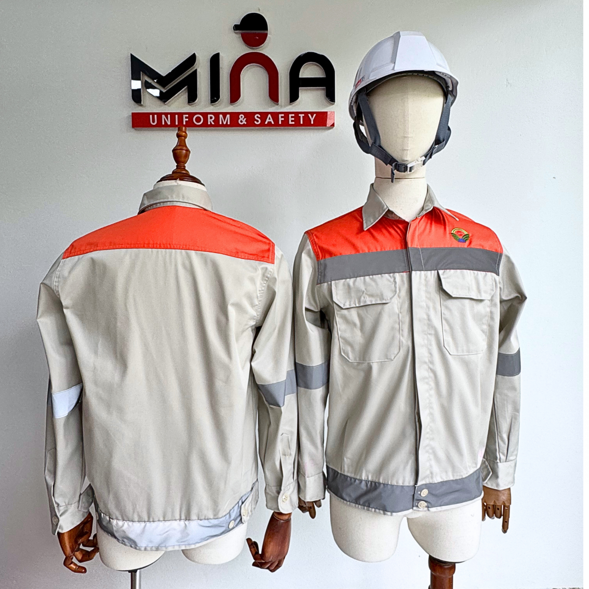 Tại Mina Safety, chúng tôi cung cấp dịch vụ thiết kế đồng phục bảo hộ lao động theo màu sắc thương hiệu, in/thêu logo công ty và may đo theo từng yêu cầu cụ thể. Khách hàng có thể yên tâm cả về thẩm mỹ lẫn chất lượng kỹ thuật.