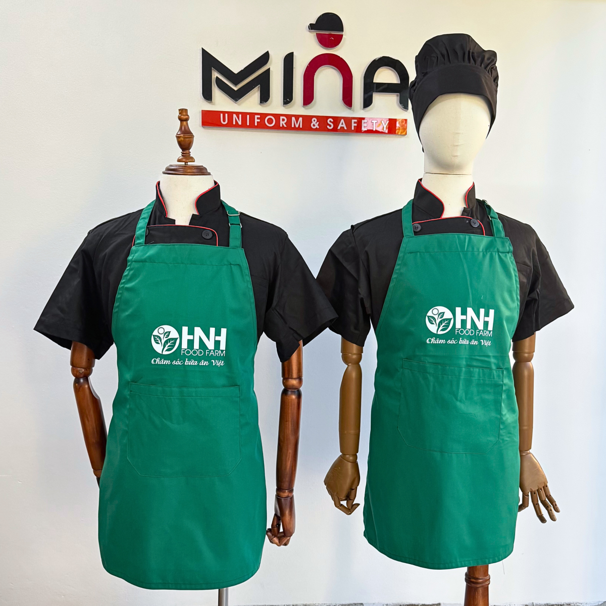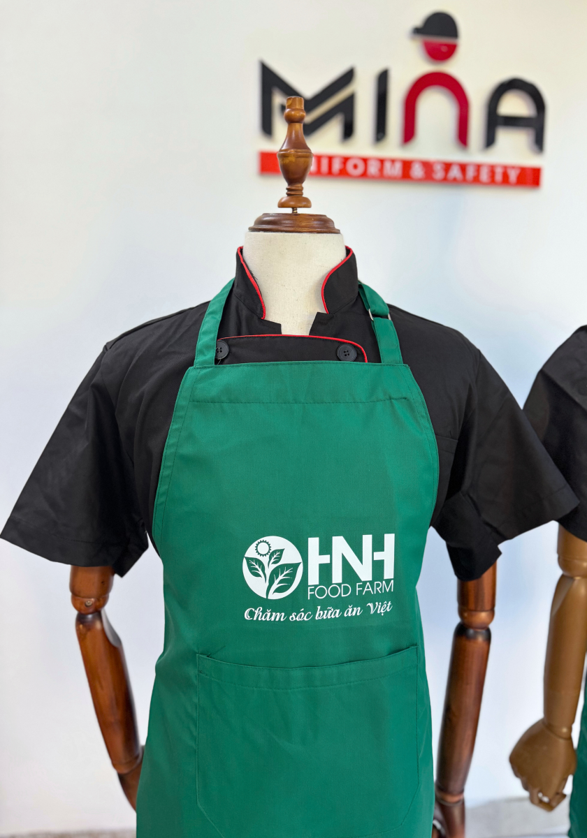Mina Safety giới thiệu mẫu tạp dề đầu bếp màu xanh lá phối áo bếp đen, được nhiều doanh nghiệp ẩm thực lựa chọn bởi: